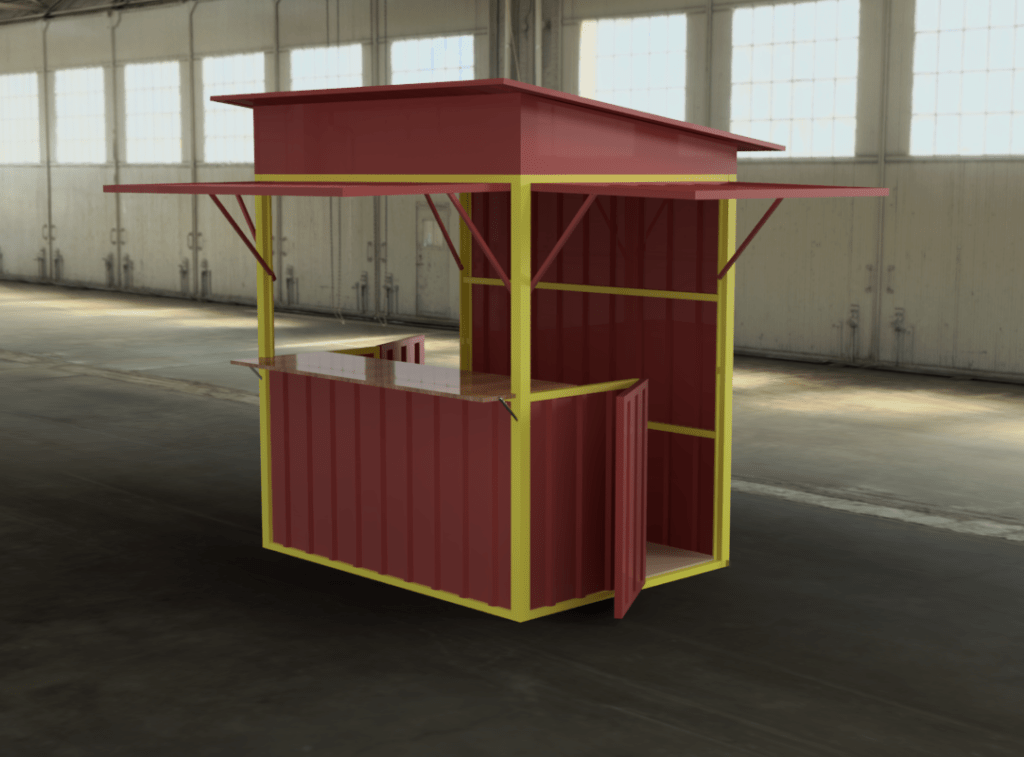 Desain booth sederhana untuk penjual skala UMKM , booth ini berbahan besi dan portable ( bisa dipindahkan sesuai dengan tempat yang ingin dijadikan tempat berjualan
